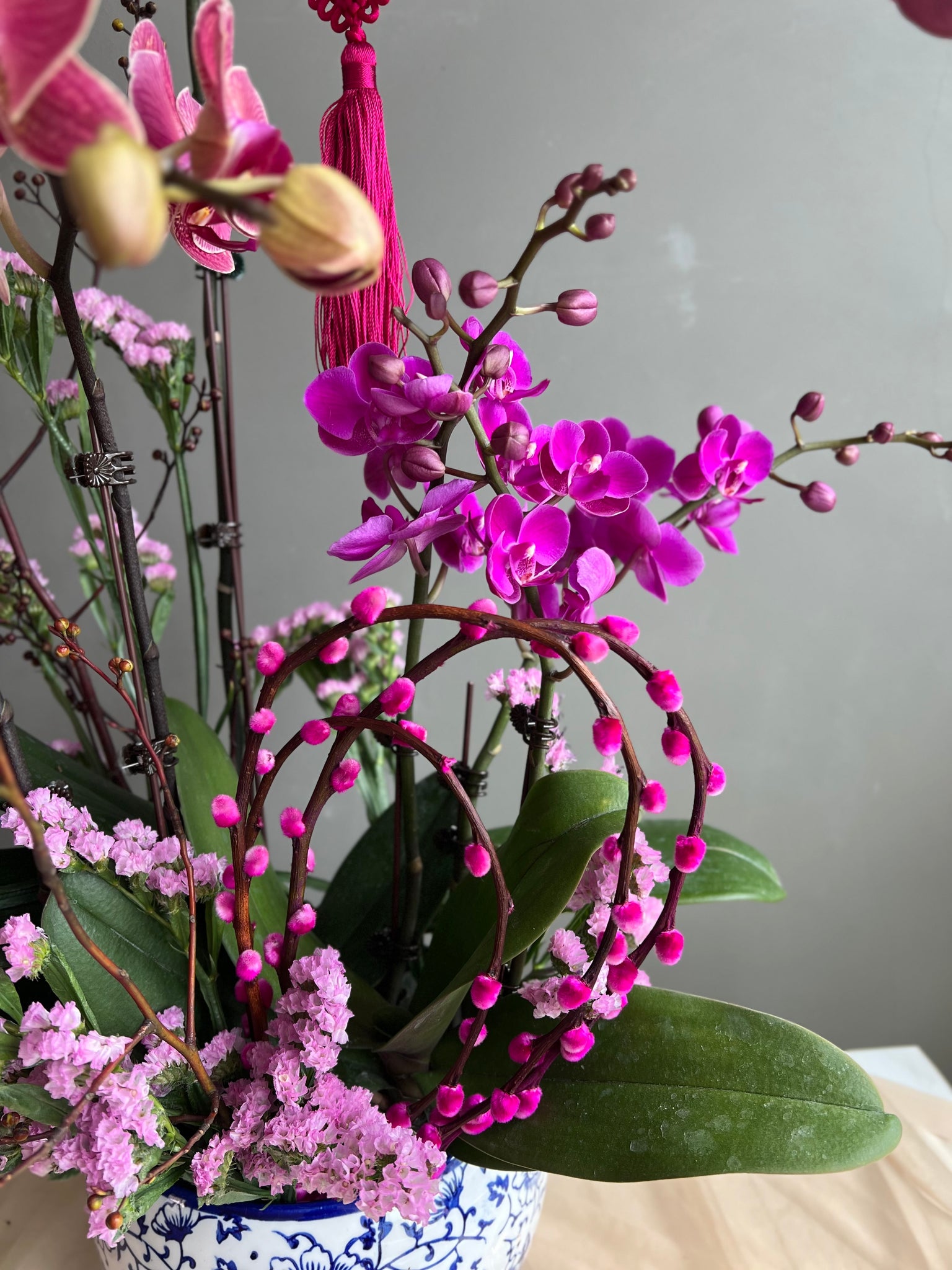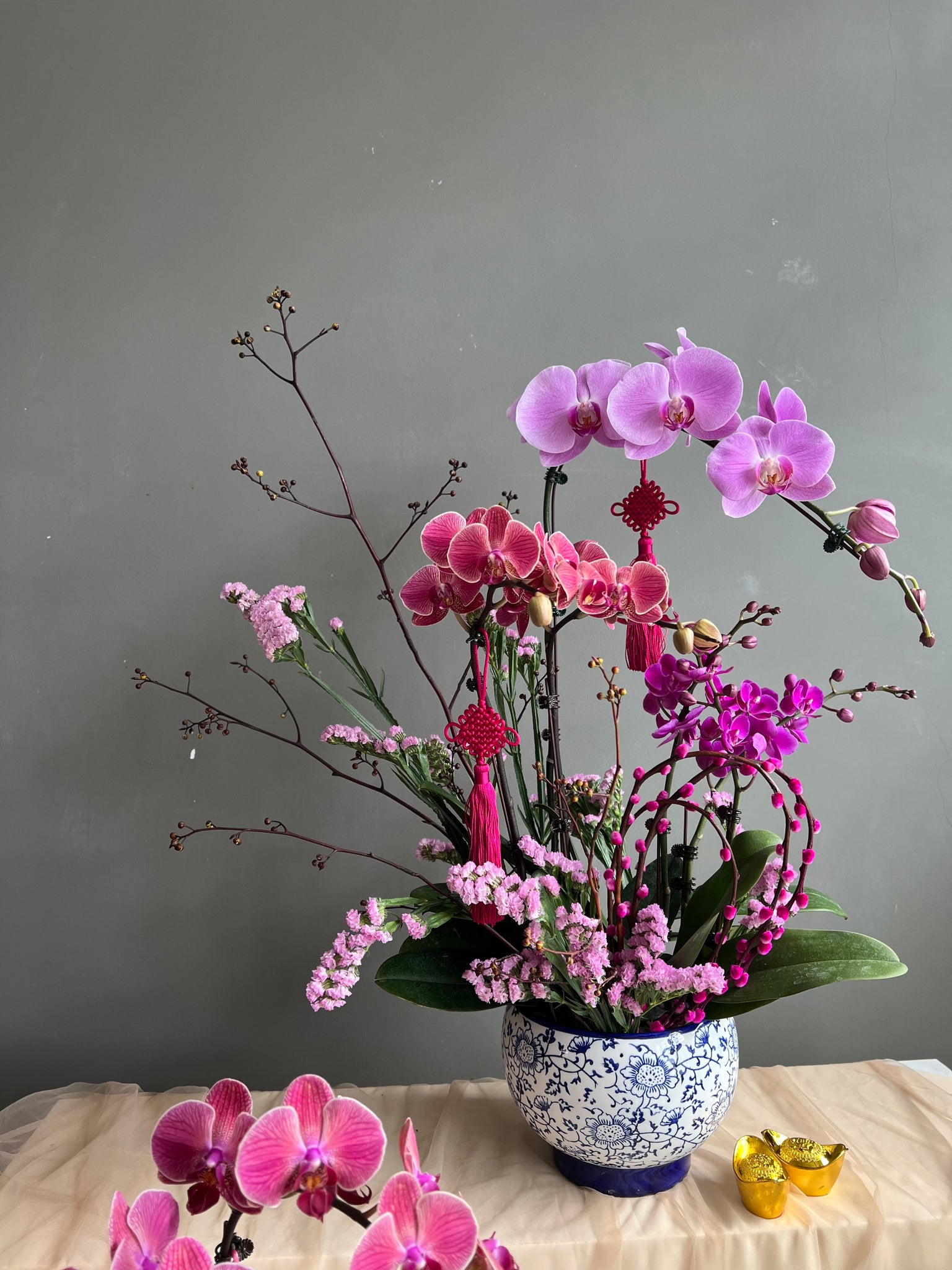 Indulge in timeless elegance this Chinese New Year with a luxurious floral arrangement of premium orchids in rich pink and violet tones, artfully styled with auspicious chinese knots and prosperity branches. Presented in an exquisite blue-and-white porcelain pot, this statement piece embodies abundance, refinement, and enduring good fortune—an exceptional gift or centerpiece for welcoming a prosperous and elegant New Year.