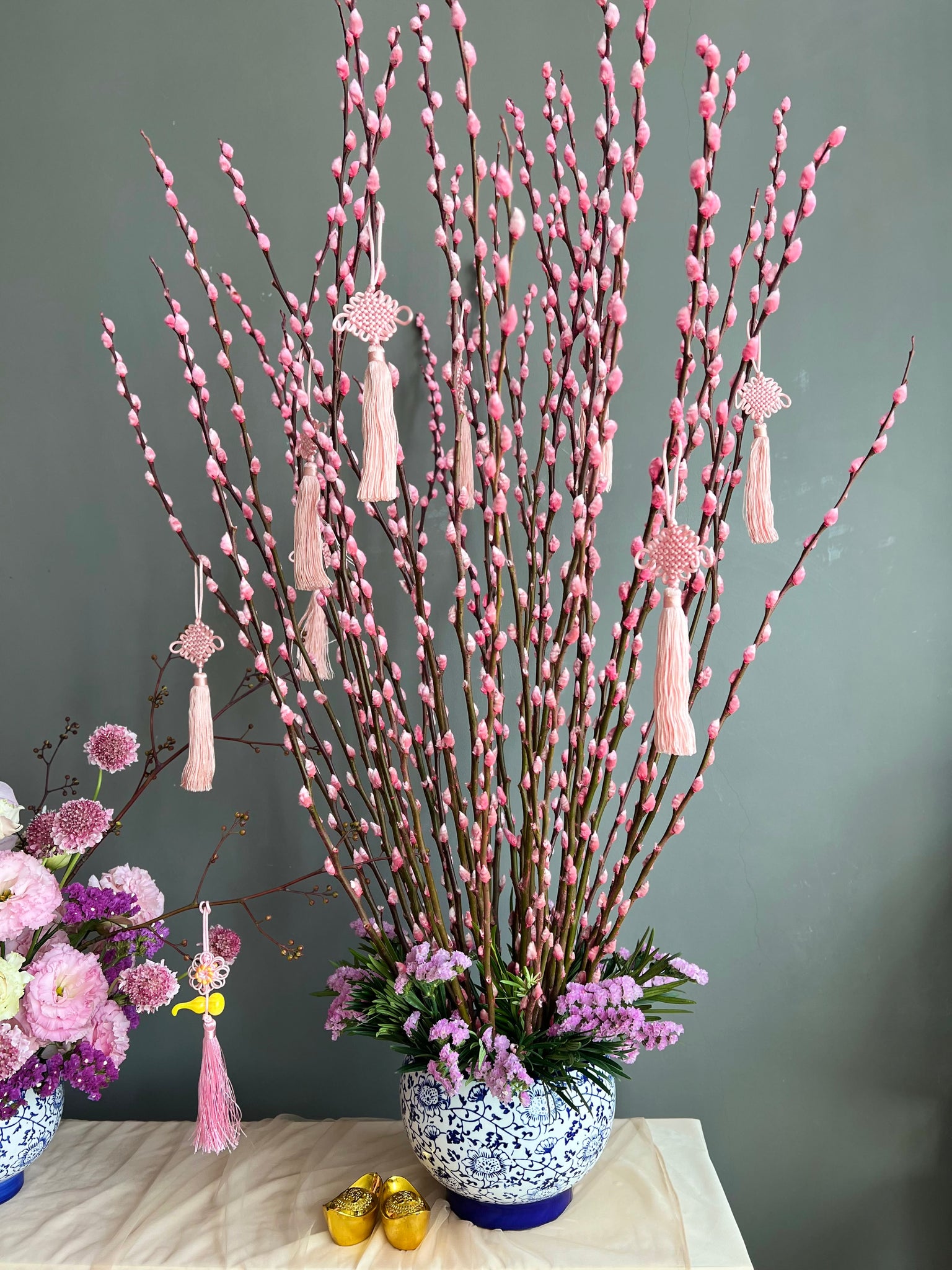 Welcoming the New Horse Year with this striking pussy willow arrangement, featuring graceful branches adorned with soft pink buds and 8 festive tassel charms symbolizing growth, renewal, and good fortune. Styled in a classic blue-and-white ceramic pot, it makes a timeless Chinese New Year centerpiece that brings auspicious blessings, height, and festive charm to any home or business space.
