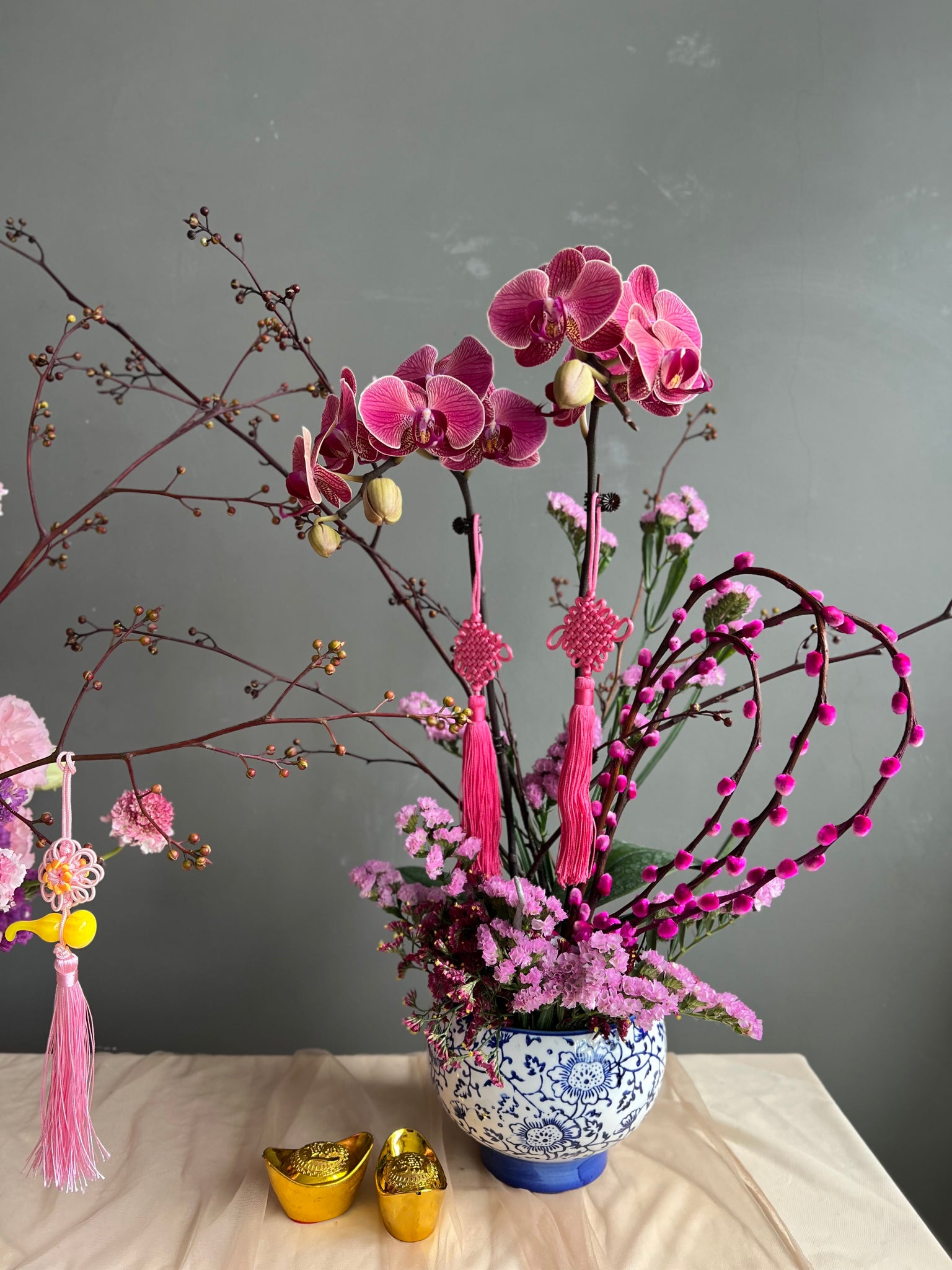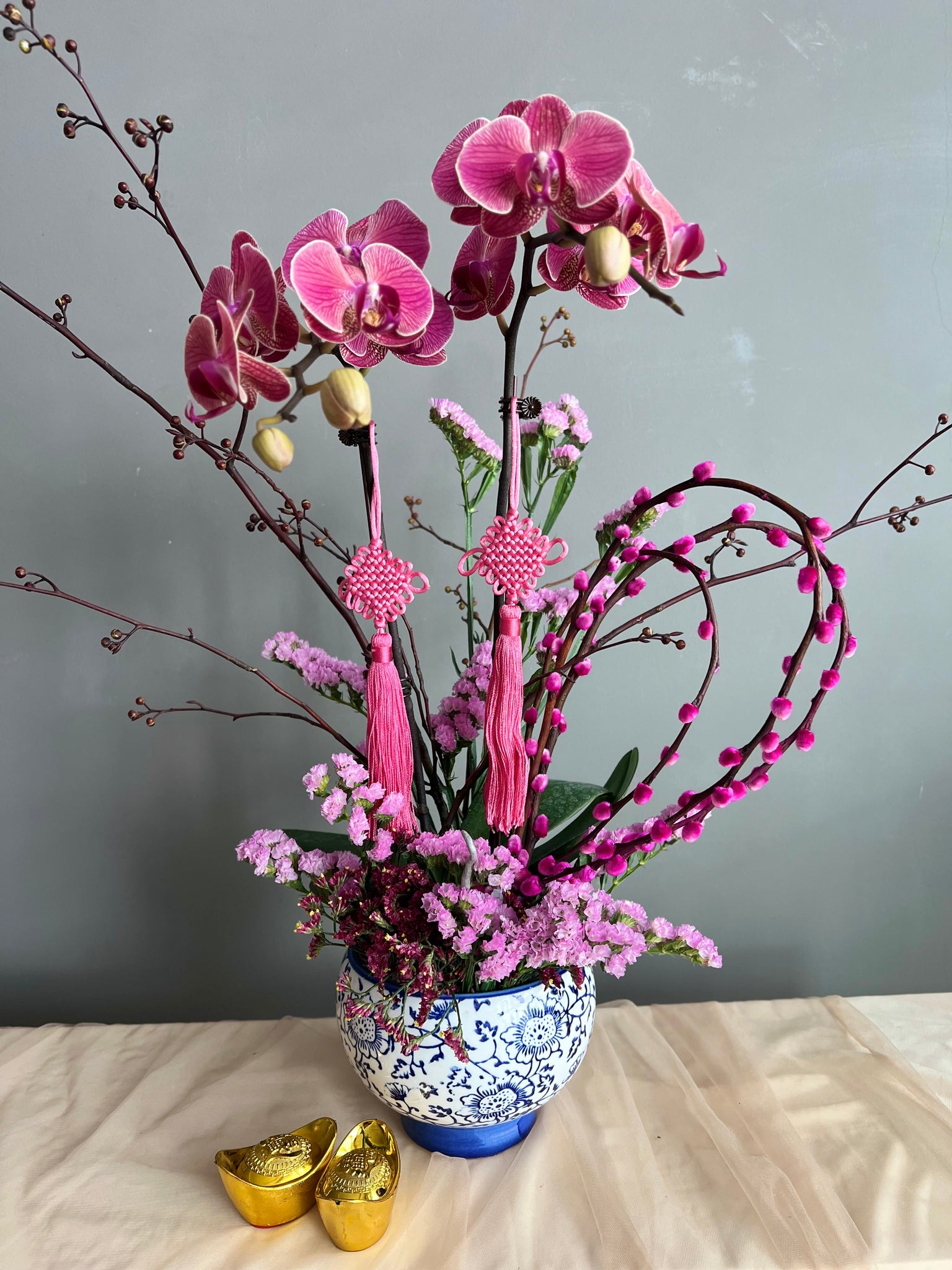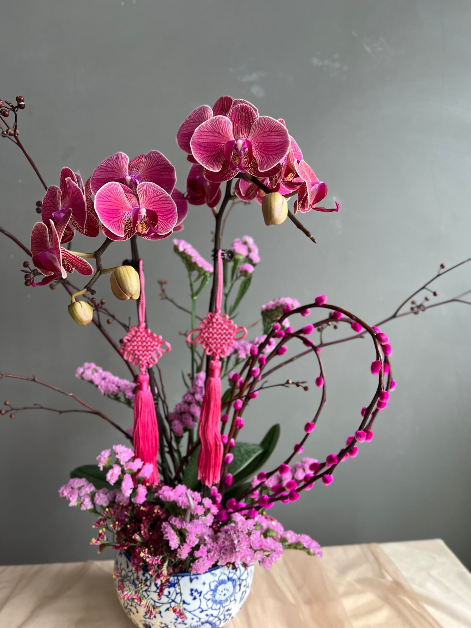 Celebrate Chinese New Year with this charming petite orchid arrangement, thoughtfully designed to bring elegance and good fortune in a compact form. Featuring vibrant pink orchids, delicate blossoms, and auspicious Chinese knots accents in a classic blue chinoise pot, it symbolizes prosperity and fresh beginnings—perfect for smaller spaces, desks, or as a tasteful festive gift that’s beautiful, meaningful, and budget-friendly.