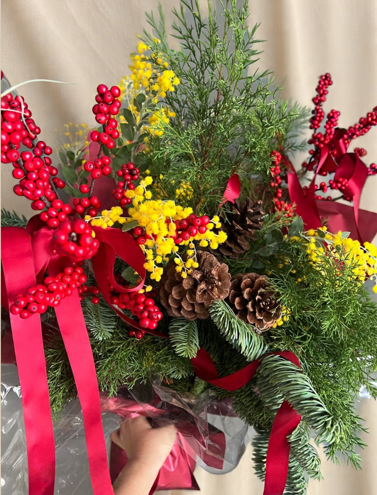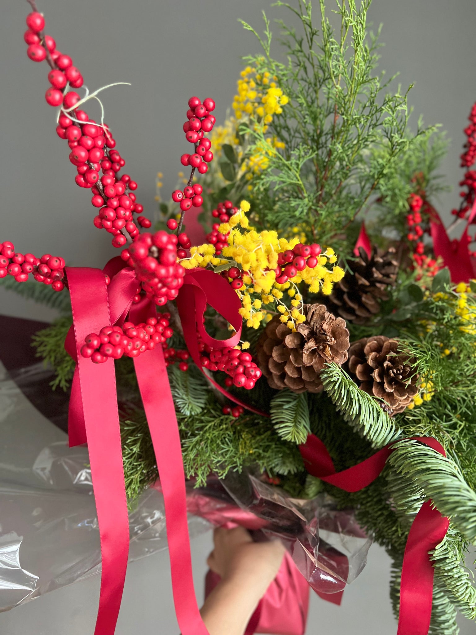 A festive joyful bunch with fresh pine tree, red Winter berries, and yellow mimosas.